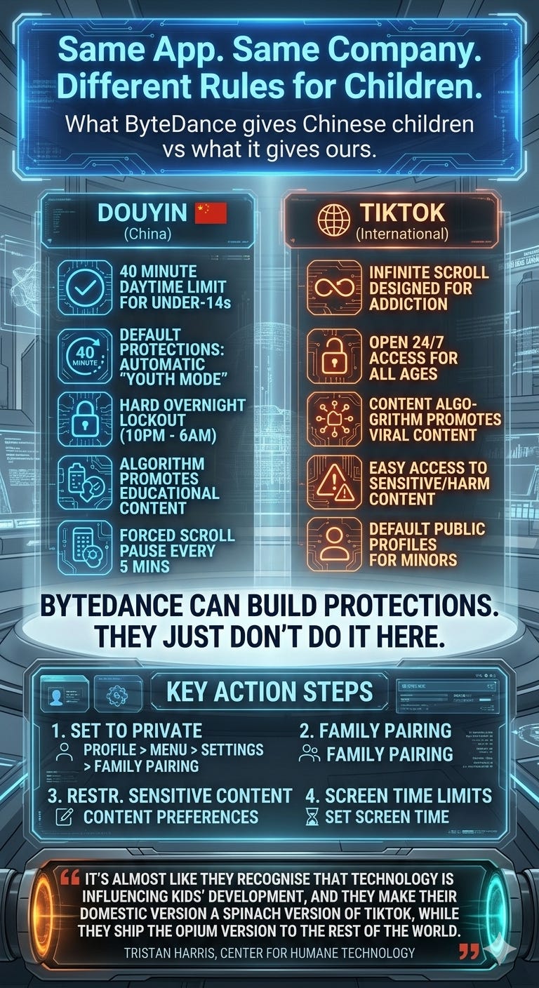 ByteDance knows exactly how to build child-protective features into this platform. They’ve proven it. The technology exists. The capability exists. The only thing that changes between China and the UK is whether the law demands it.