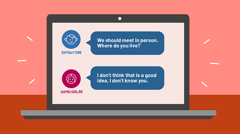 Remind them about strangers — Remind them never to share private or personal information. Use examples, such as “You shouldn’t give your number to a stranger on the street. Is somebody online you don’t know any different?” Give examples of other personal information such as names, locations, school.