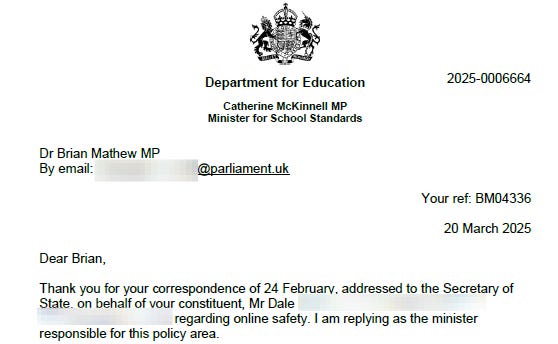 It was pretty much the same response as the last time I tried, it could almost be a copy and paste but I have added the letters to a gallery below and you can decide for yourselves. However, this time I didn’t even warrant a reply from the Secretary of State for Education. I am thankful to Dr Brian Matthew for caring enough to try and get my message across.