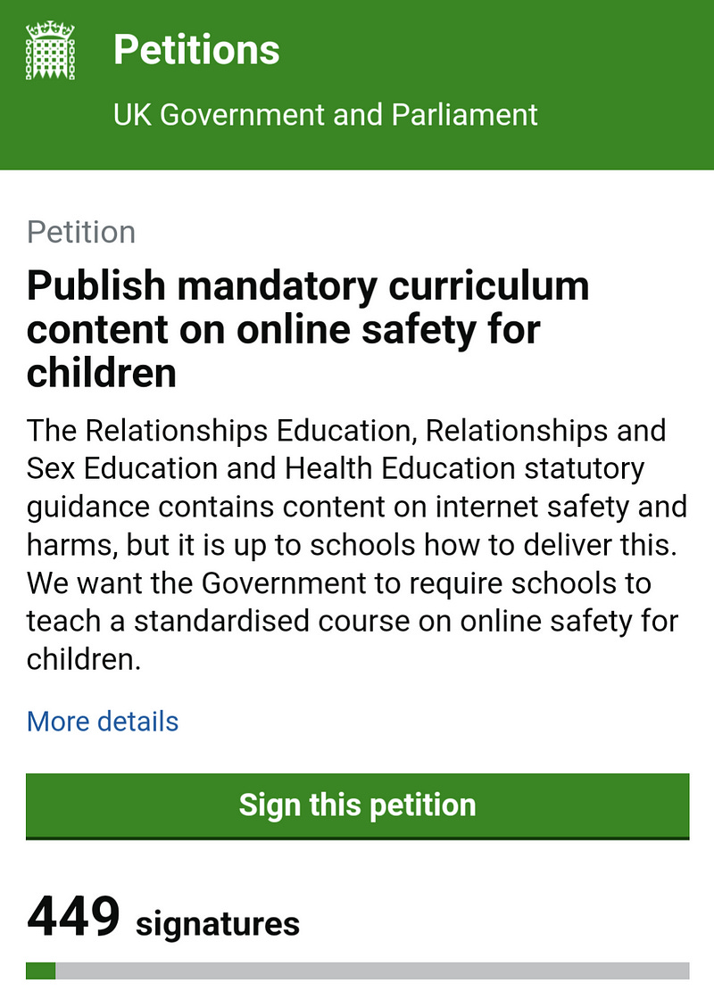 I wanted to give a bit of an update on the petition to have an official education package teaching ‘Online Child Safety’ added to the curriculum for all schools in the UK.